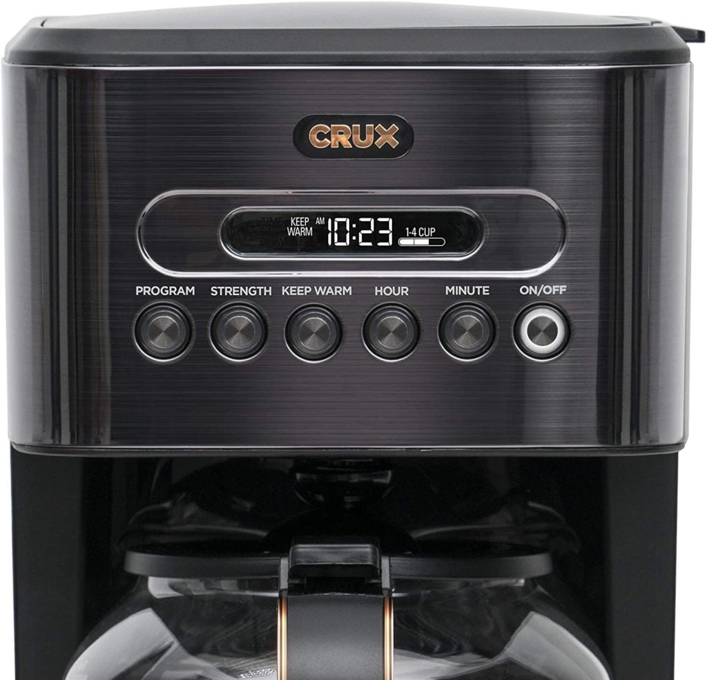 The CRUX 14 Cup Programmable Coffee Maker brings new meaning to no nonsense mornings. Powered with a 1,200 watt brewing system, your coffee is made and kept hot all morning long.