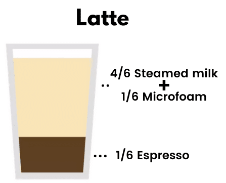 - Ingredients: 1/6 espresso, 4/6 steamed milk, 1/6 foamed milk.