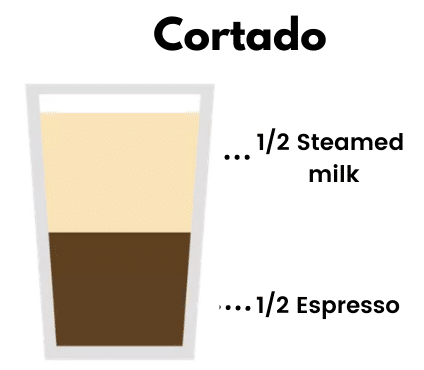 A cortado is made with 1 part milk and 1 part espresso and it comes in a small serving.